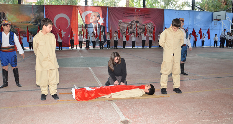 Savaş dönemini anlatan görsellerle desteklenen programda coşku, gurur, hüzün ve gözyaşı bir aradaydı. Ortaokul öğrencilerinin yaptıkları sunumlarda 109. yılı anılan Çanakkale Zaferi ile ilgili türküler seslendirildi, dönemi anlatan drama gösterileri sunuldu, oratoryo ve şiirler ile izleyenleri duygulandıran gösterilerin ardından zeybek oyunu ile gurur dolu anlar yaşandı. Coşkulu bayrak geçişi töreninin ardından program sona erdi.
