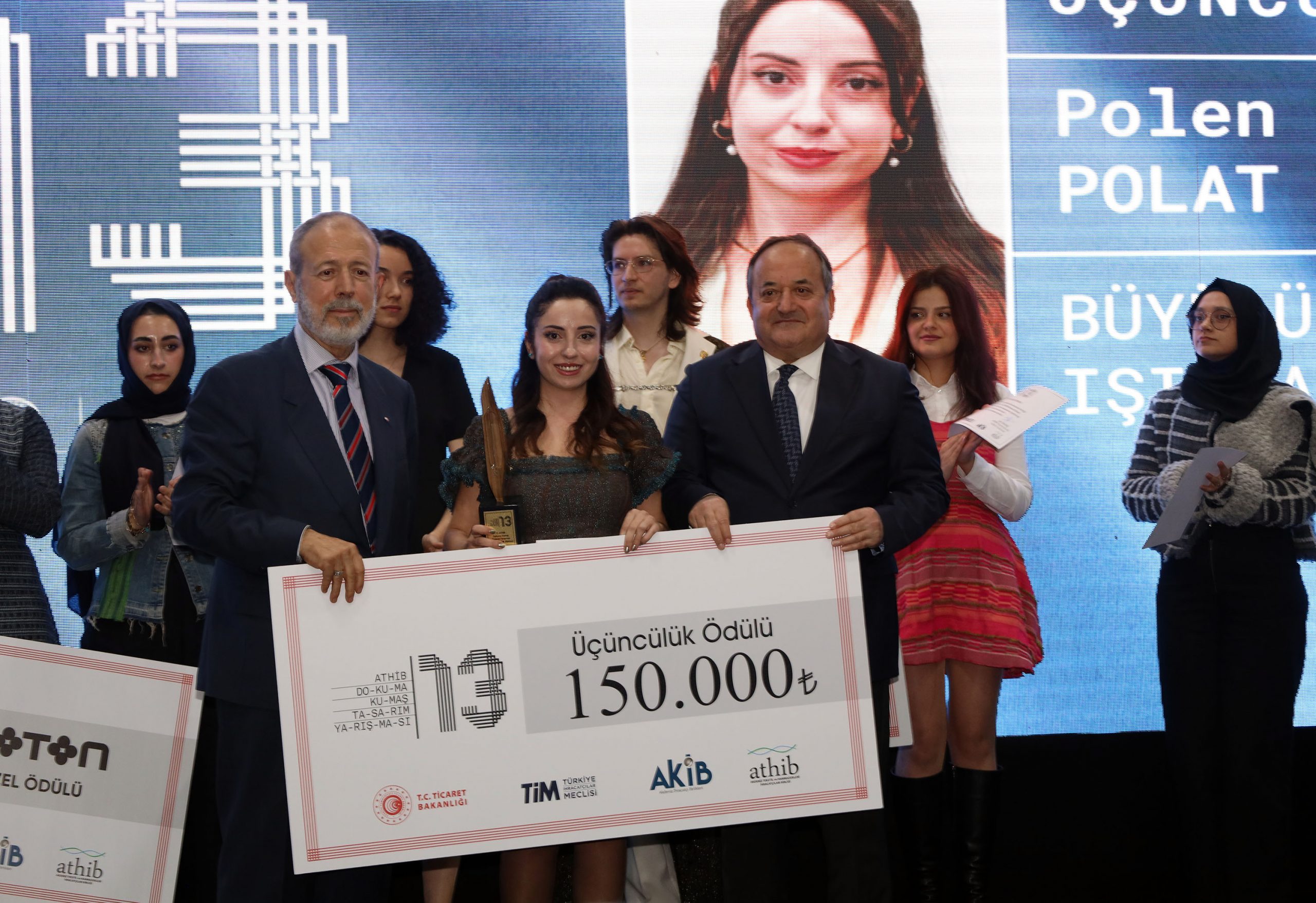 ATHİB 9. Dokuma Kumaş Tasarım Yarışması’nın birincisi Mimar Sinan Güzel Sanatlar Üniversitesi mezunu Kübra Çolak da sahneye çıkarak tamamladığı yurt dışı eğitiminde elde ettiği kazanımları anlattı. ATHİB Başkanı Fatih Doğan, sahneye davet edilen finalistlere katılım belgelerini verirken, sponsorluk desteği sağlayan firmaların temsilcilerine de teşekkür belgelerini takdim etti.