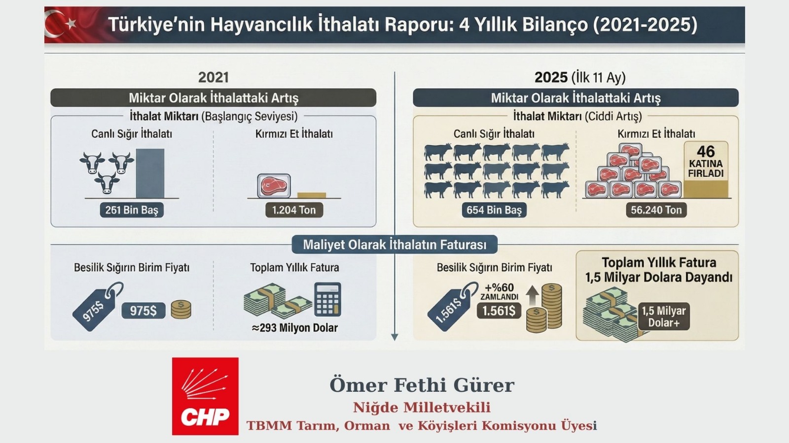 CHP Niğde Milletvekili ve TBMM Tarım,Orman ve Köyişleri Komisyon Üyesi Ömer Fethi Gürer 2025 yılında artan canlı hayvan ve et ithalatının 2026 yılında da devam edeceğinin ve yerli hayvancılık yapanların bu yılda dertli bir yıl yaşayacağını söyledi .2021 yılı ile 2025 yılı arası ithal canlı sığır ve et verileri değerlendirdi.