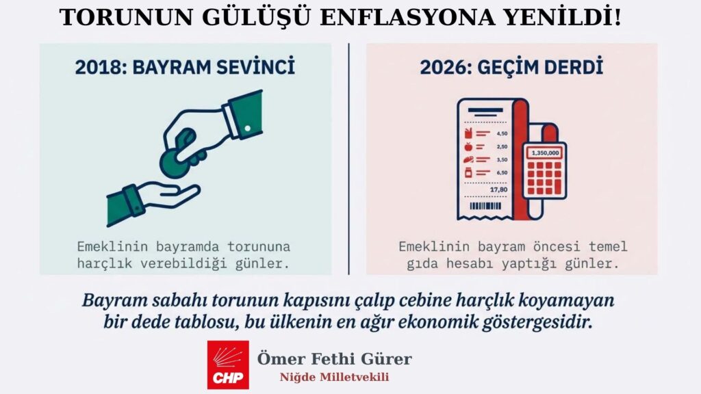Emeklinin artık bayram öncesi torununa harçlık vermeyi değil, temel gıda alabilme hesabı yapmayı düşündüğünü belirten CHP Milletvekili Ömer Fethi Gürer, “Bayram sabahı torunun kapısını çalıp cebine harçlık koyamayan bir dede tablosu, bu ülkenin en ağır ekonomik göstergesidir. Emeklinin bayramını geri verin. Bayram ikramiyesi göstermelik değil, gerçek alım gücünü koruyan bir düzeye çıkarılmalıdır. Büyüklerin torununa gönül rahatlığıyla harçlık verebildiği günler geri gelmeden ülkede ekonomi düzeldi denemez” şeklinde konuştu.