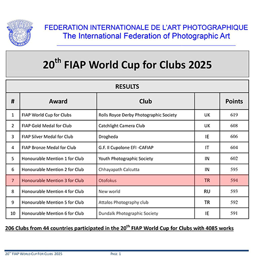 Bu yıl 20’ncisi düzenlenen, dünyanın en prestijli fotoğraf organizasyonlarından biri olan FIAP Dünya Kulüpler Kupası’nda OTOFOKUS; 44 ülkeden 206 kulüp ve dernek arasından sıyrılarak Dünya 7.’liği ve Mansiyon Ödülü’nü kazanırken, Türkiye 1.’si olarak zirveye yerleşti.