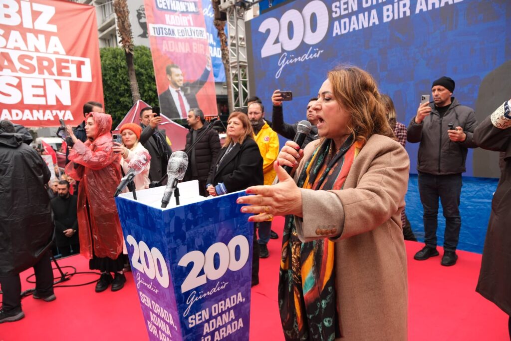 CHP Adana Milletvekili Müzeyyen Şevkin konuşmasında, “Bunların hepsinin üstesinden hep beraber geleceğiz. Ama birincil önceliğimiz Zeydan başkan olmak üzere bütün başkanlarımızın tutsaklıktan kurtulması ve bu ülkede hukukun üstünlüğünün sağlanması, özgürlüklerin alabildiğine bu ülkeye yansıması. İnşallah 27’sinde başkanlarımızla karşınızda olacağız diyorum” dedi.