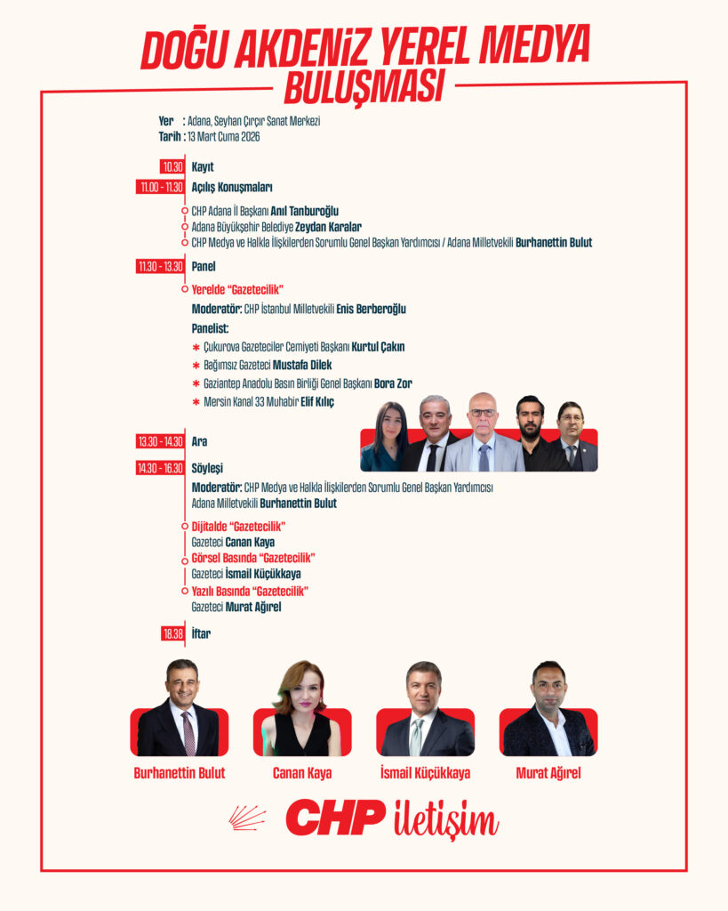“Yerel basınımızla doğrudan ve kalıcı bir iletişim zemini oluşturmak ve geliştirmek amacıyla 13 Mart’ta Adana’da “CHP İletişim Doğu Akdeniz Yerel Medya Buluşması”nı düzenliyoruz.